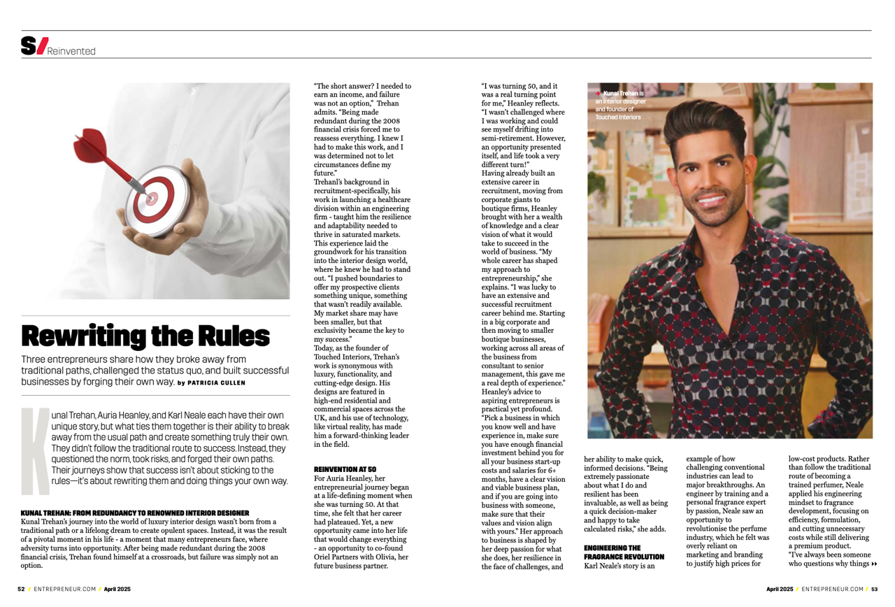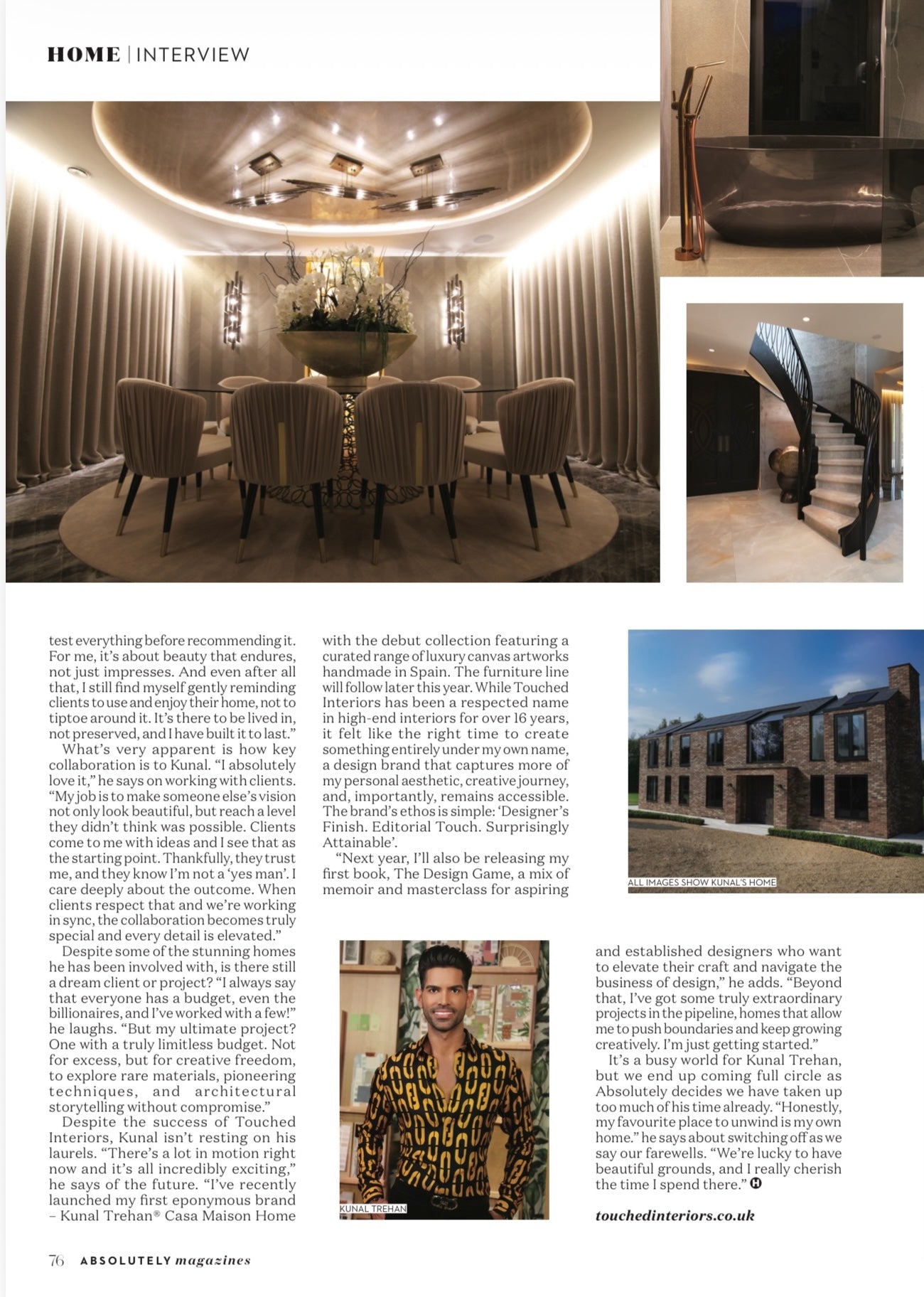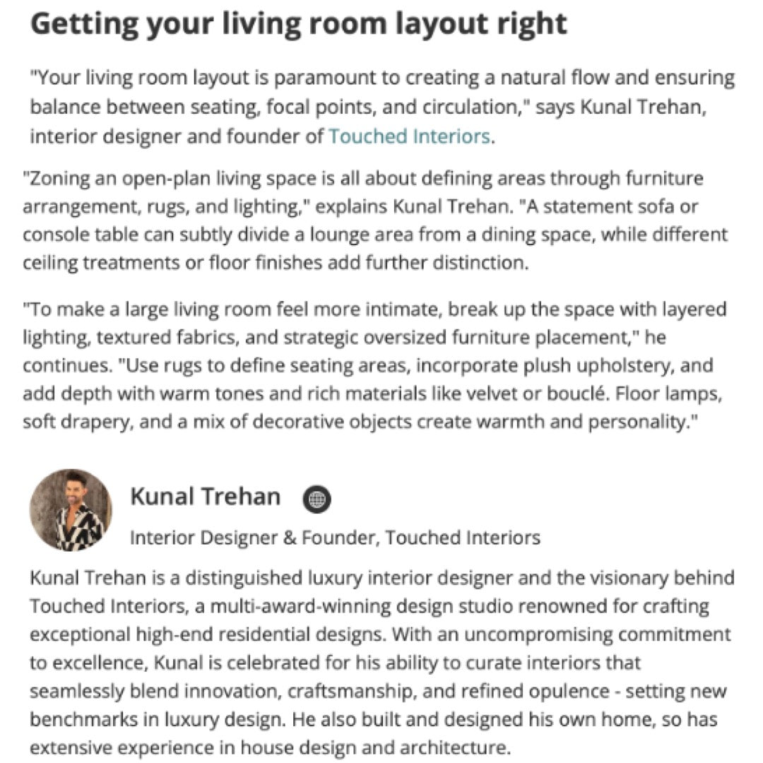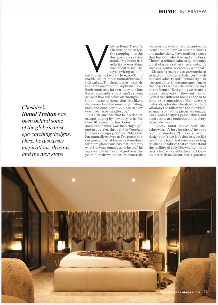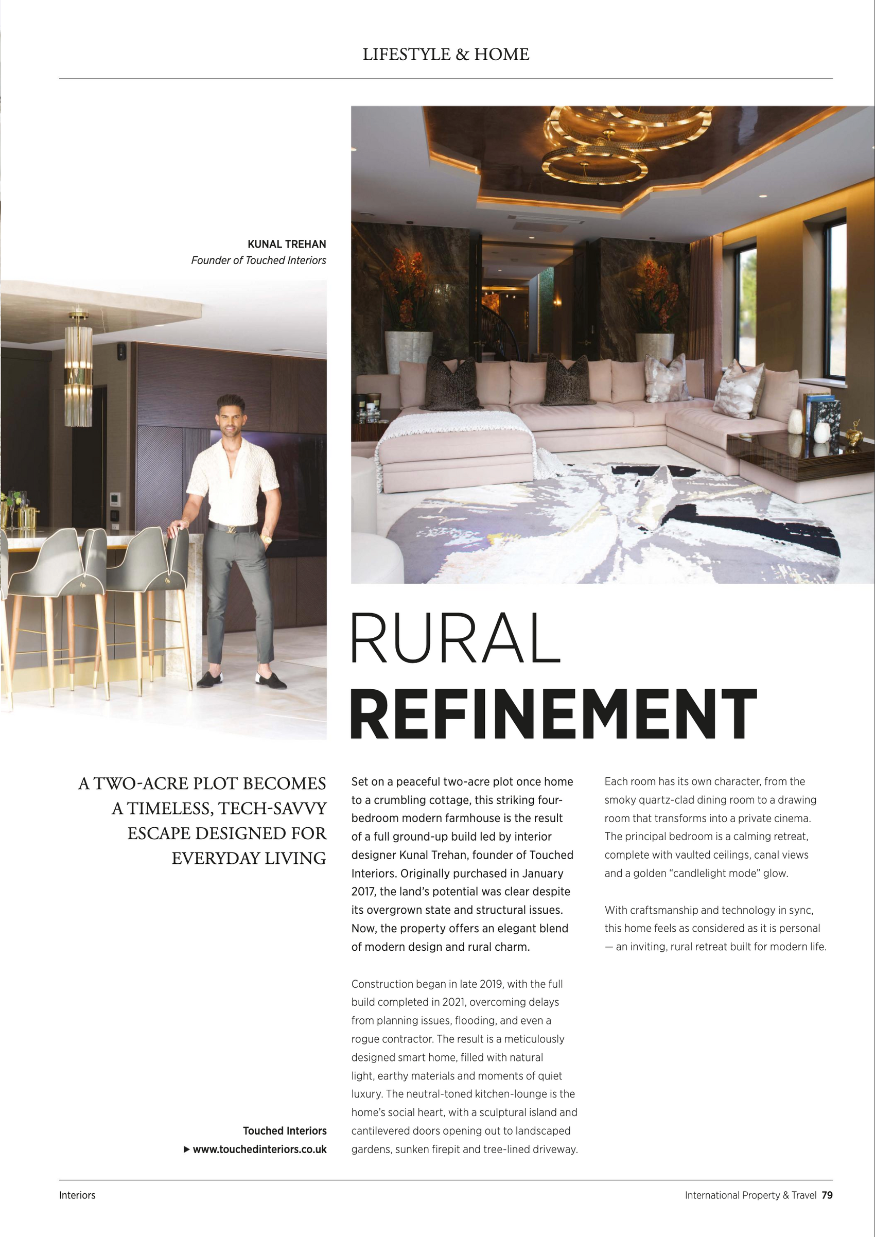 From magazine covers to interiors features and TV screens, Kunal Trehan has firmly established himself as a leading voice in luxury interior design. His work has been spotlighted by industry tastemakers and design publications across the UK and beyond, celebrated for its sculptural aesthetic, refined materiality, and global point of view.