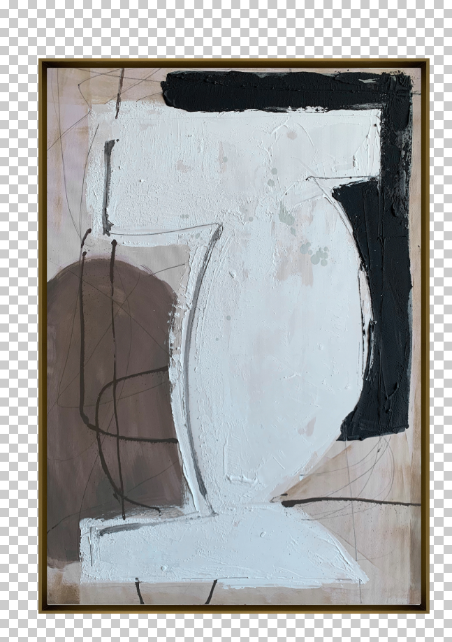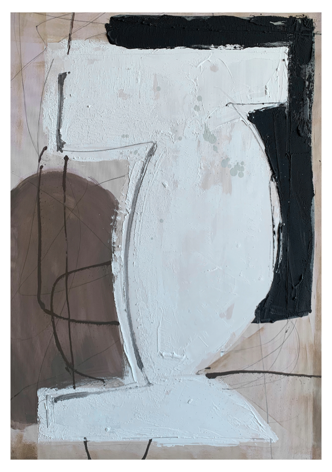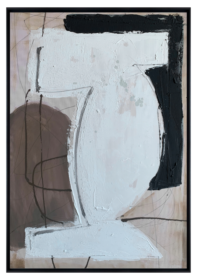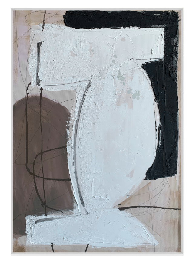 Alvoron captures the essence of form and balance through bold white contours and textured contrast. The central shape, reminiscent of a sculptural fragment, stands grounded yet abstract against a soft wash of taupe and ink-black framing. Linear markings crisscross the surface like blueprints or quiet murmurs of motion beneath the surface. This piece evokes a feeling of weight and stillness, with just enough suggestion of movement to stir the imagination.
