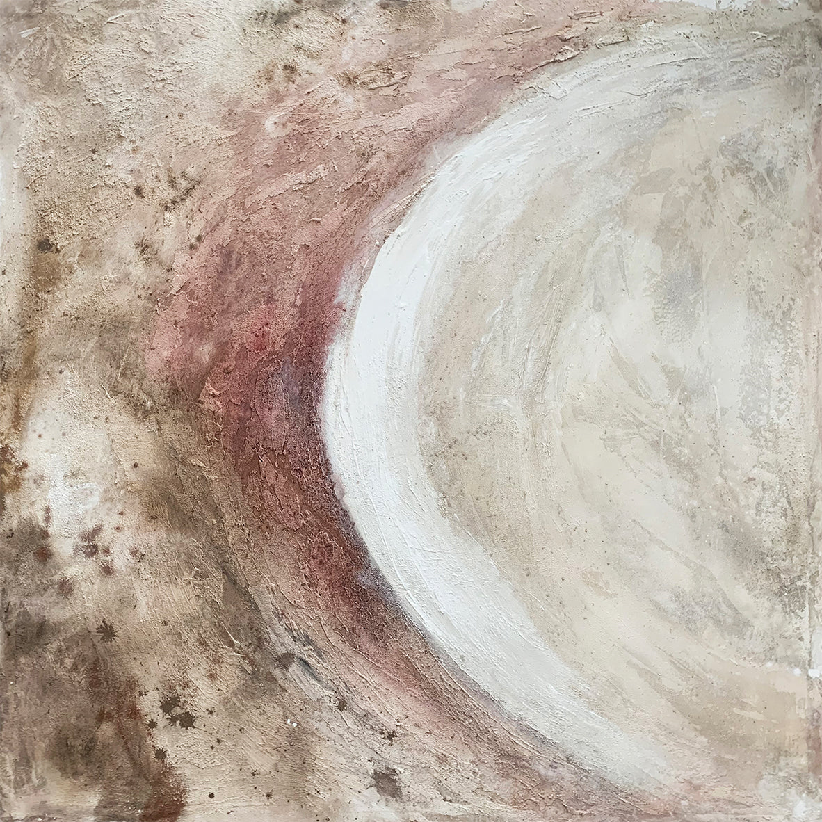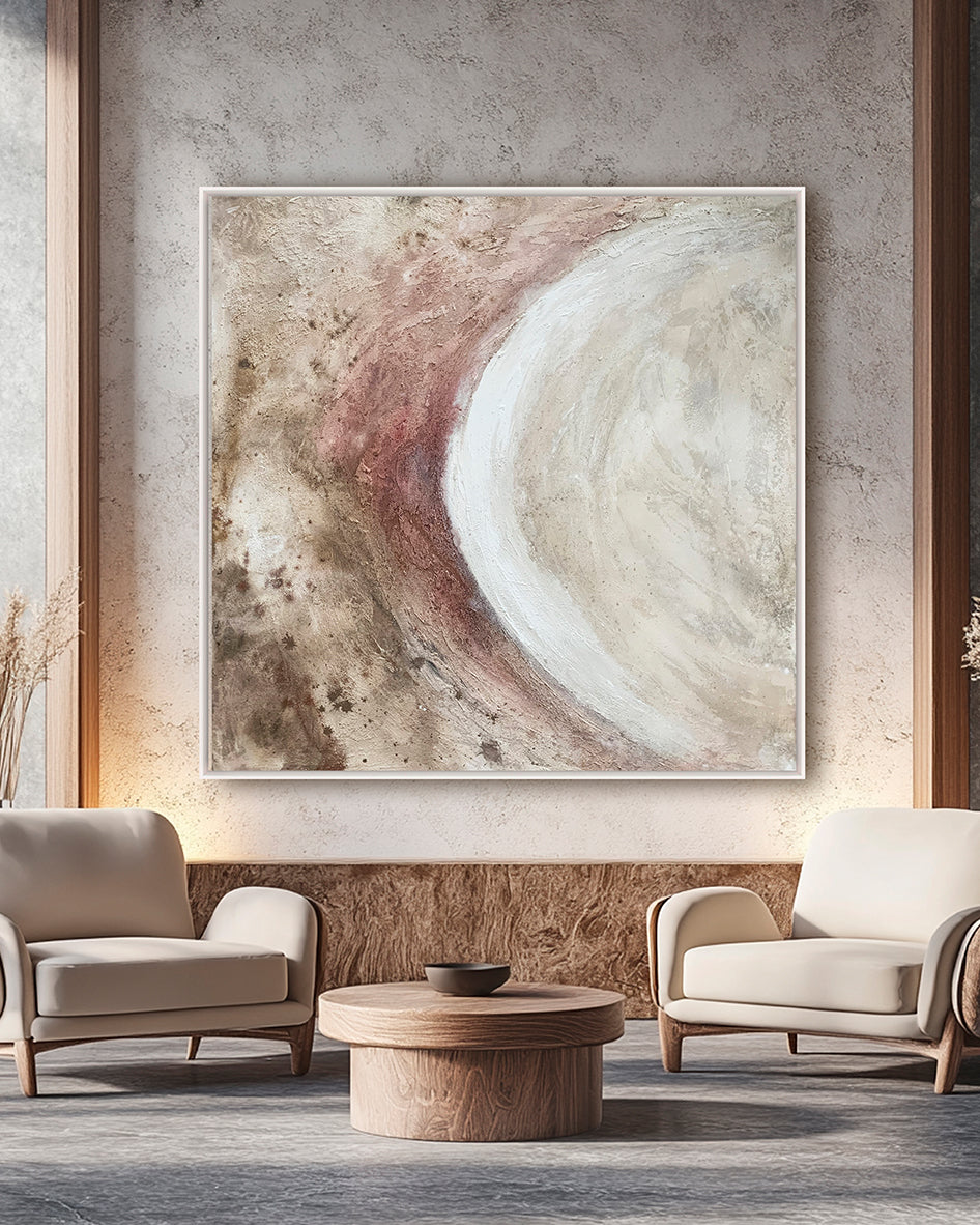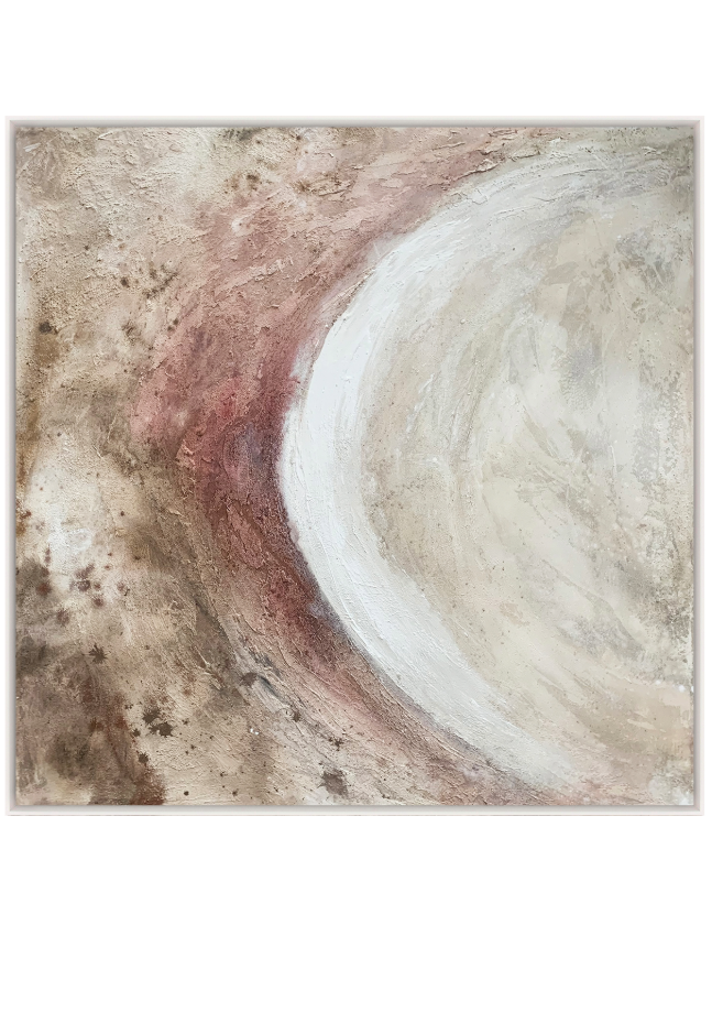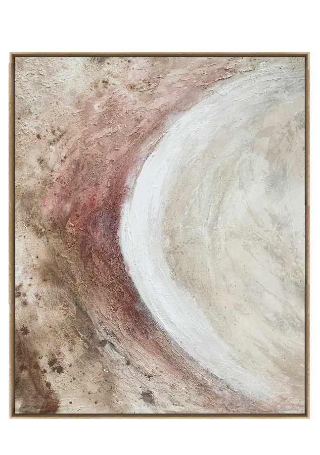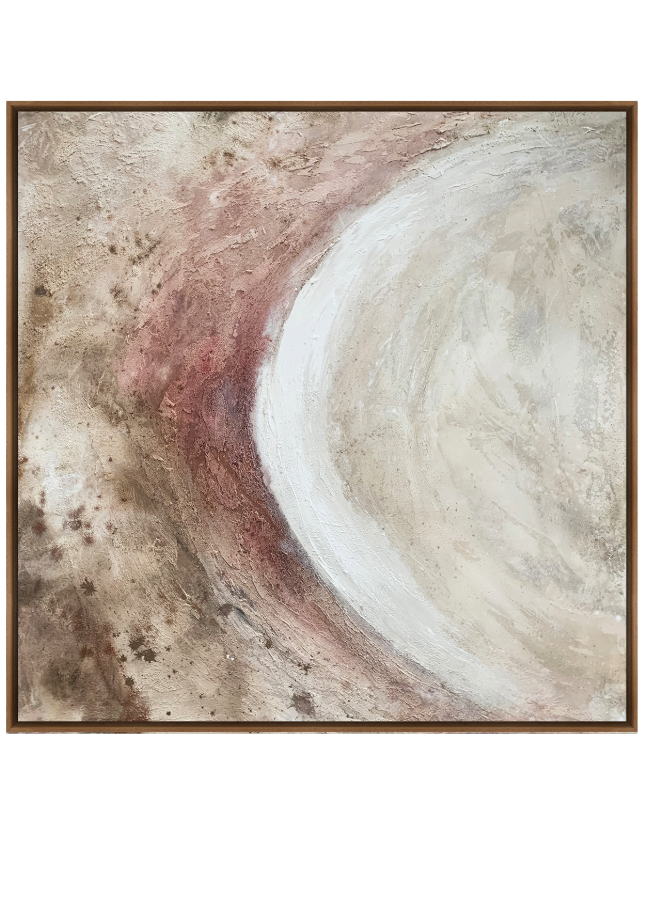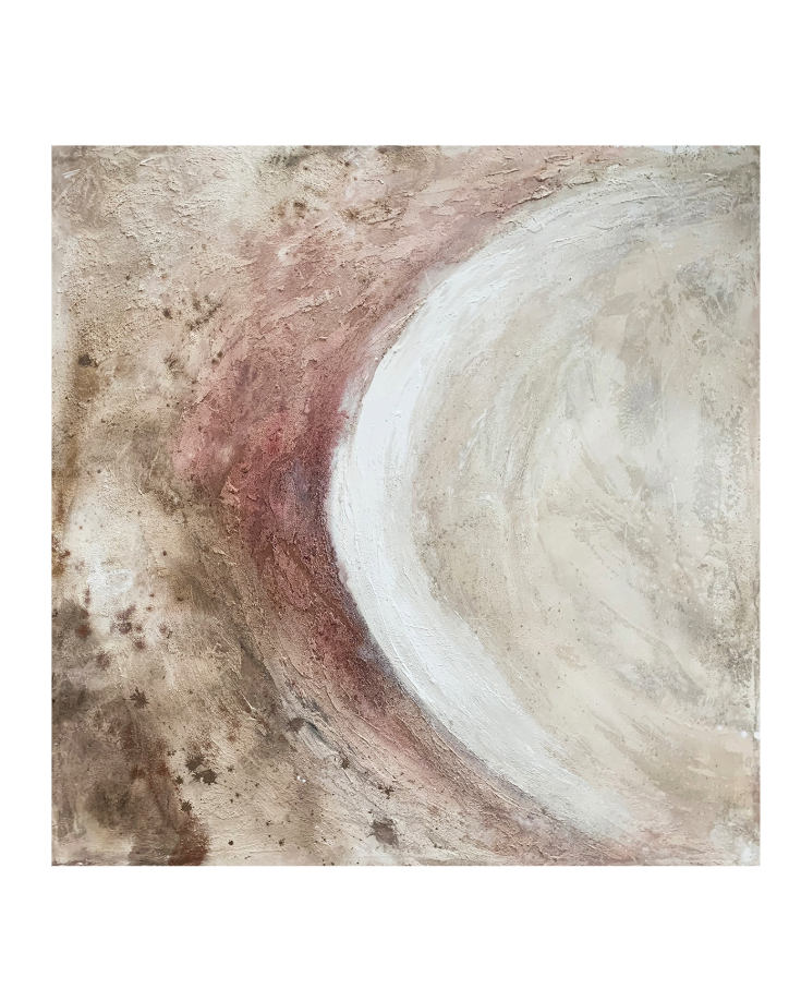 Cerra is quietly evocative, with a soft lunar arc emerging from a palette of warm clay, ivory and rose-dusted earth. The textures feel aged yet ethereal, like a worn fresco or celestial surface. This piece balances presence with stillness, making it perfect for spaces that invite reflection and slow beauty.