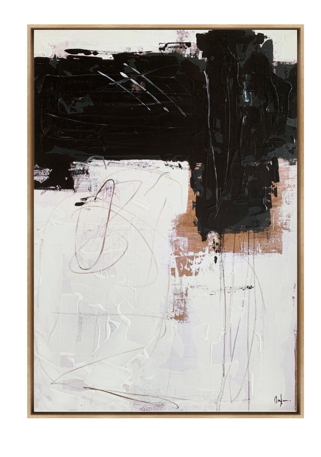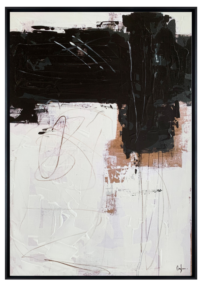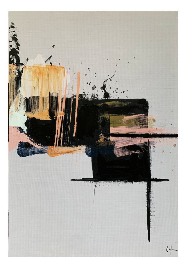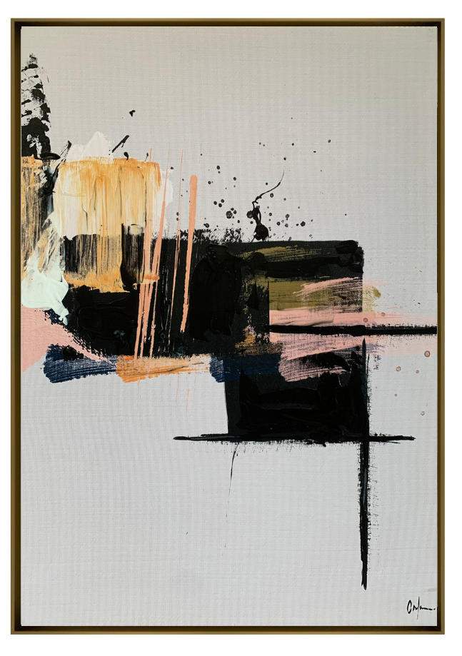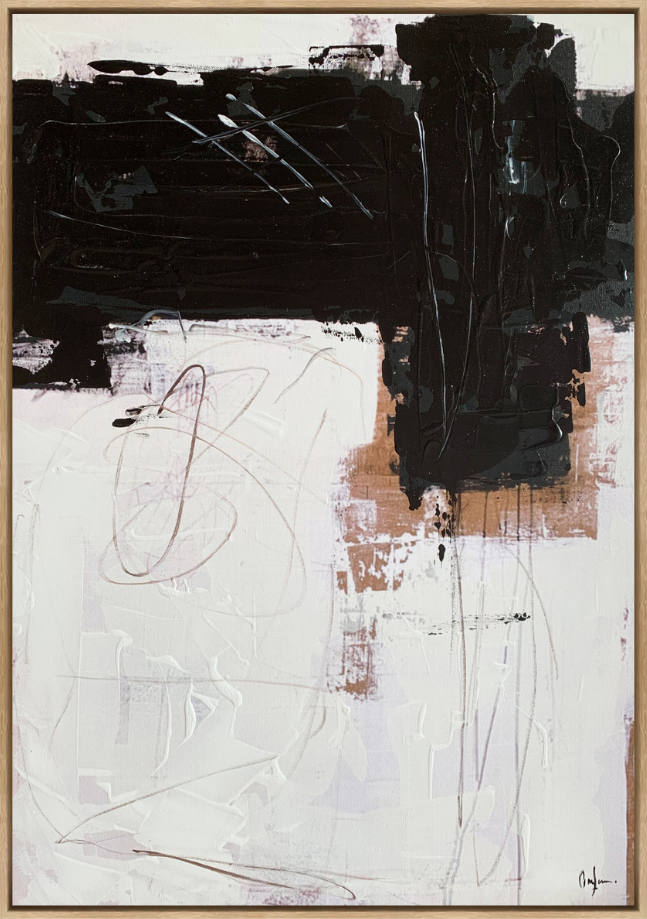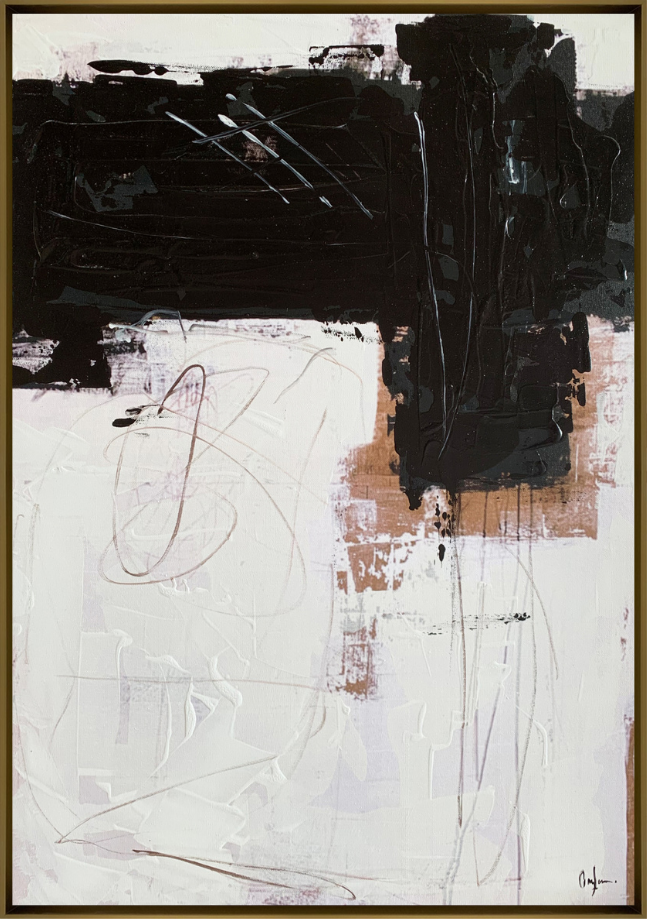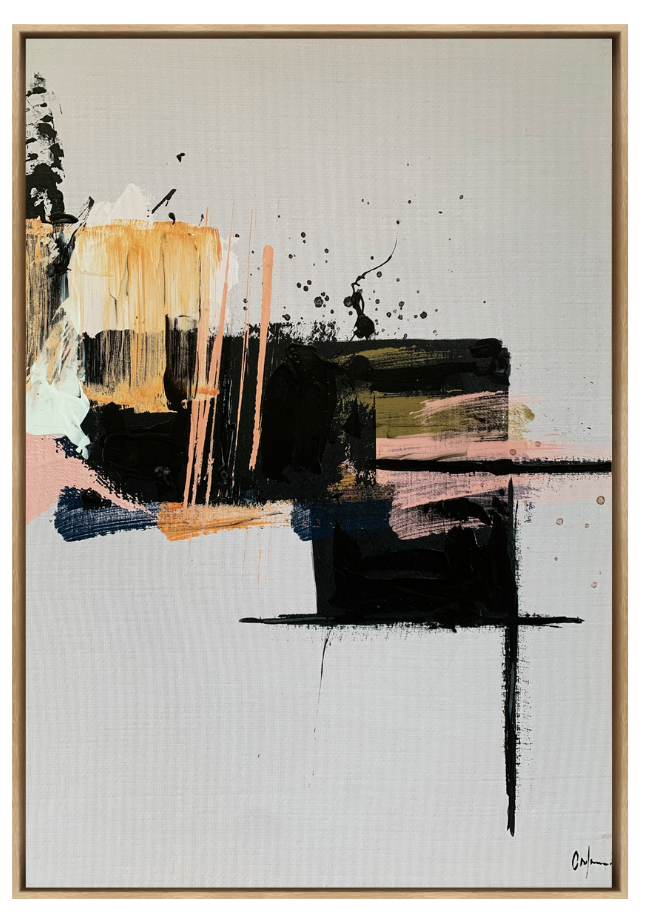 Cortile 1 balances energy and elegance, layering gestural strokes in burnt peach, midnight black and muted gold. Flecks and splatters hint at spontaneity, yet the composition is deliberate, like a courtyard echoing with footsteps, shadows, and quiet drama. It’s both architectural and expressive, with a distinctly refined modern edge.Perfect on its own or even more powerful when brought together as a set with Cortile 2.