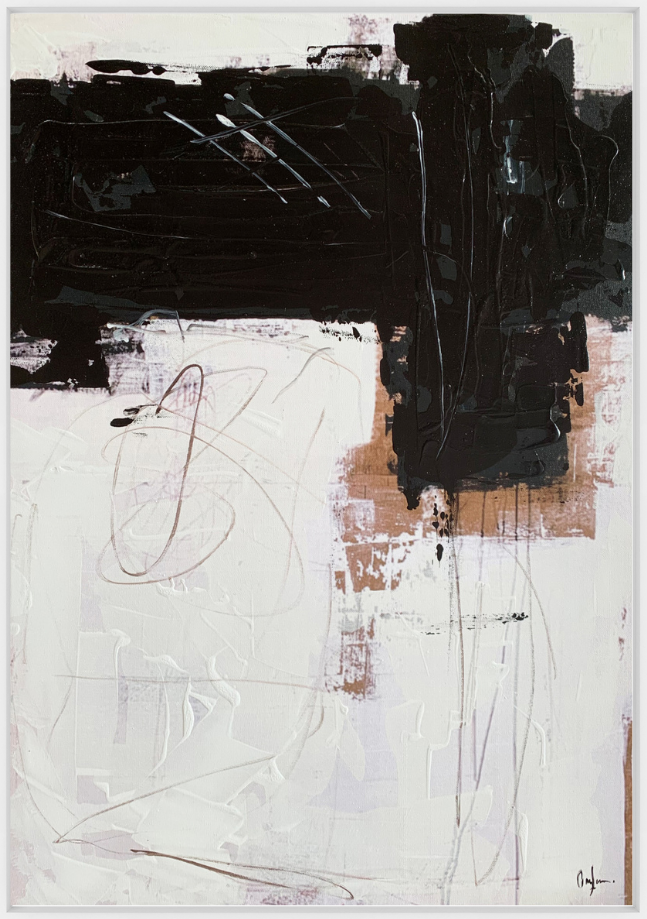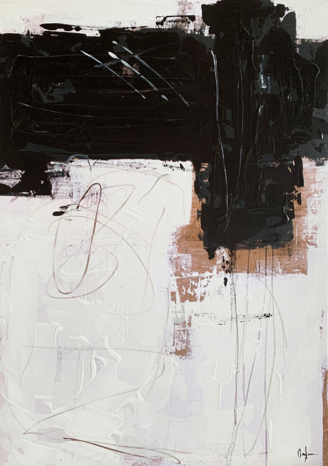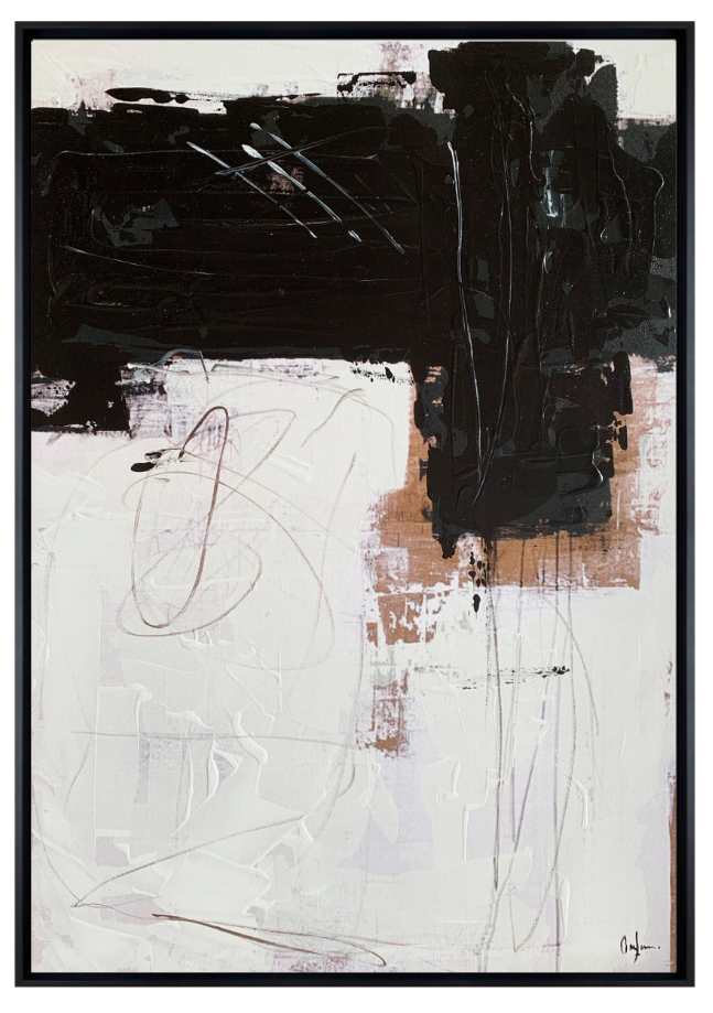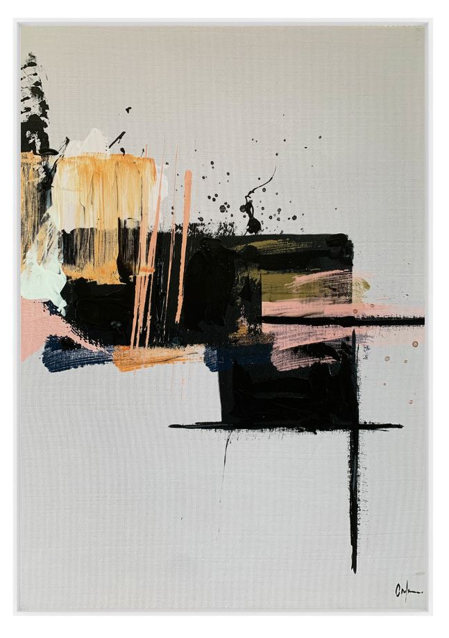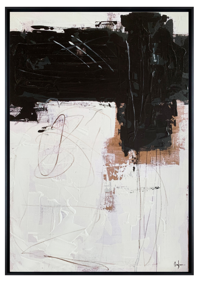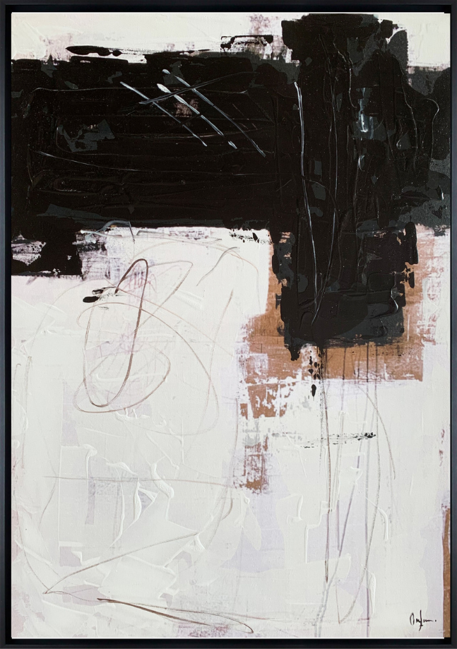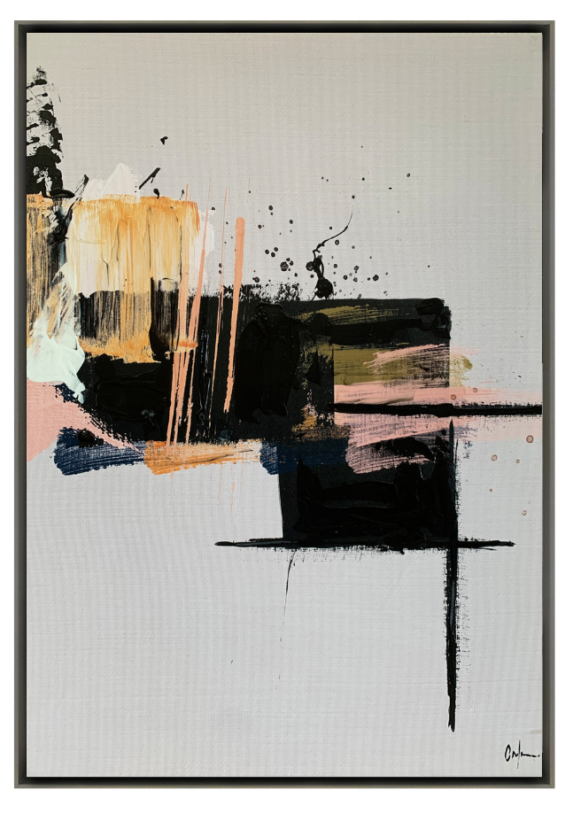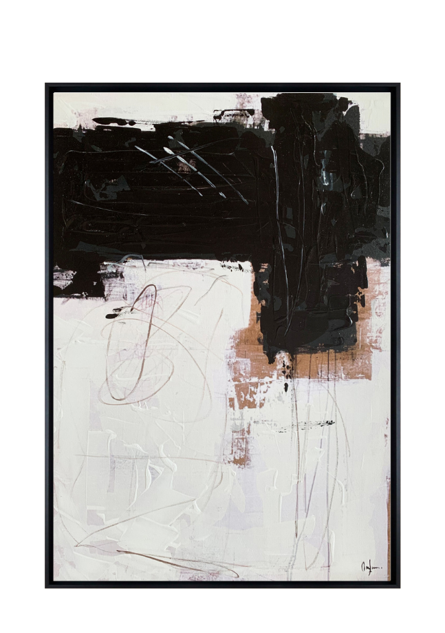 Cortile 1 balances energy and elegance, layering gestural strokes in burnt peach, midnight black and muted gold. Flecks and splatters hint at spontaneity, yet the composition is deliberate, like a courtyard echoing with footsteps, shadows, and quiet drama. It’s both architectural and expressive, with a distinctly refined modern edge.Perfect on its own or even more powerful when brought together as a set with Cortile 2.