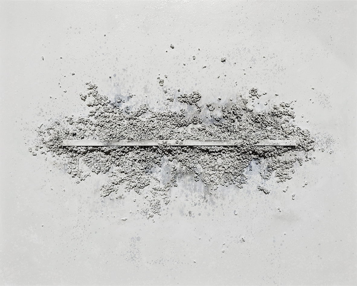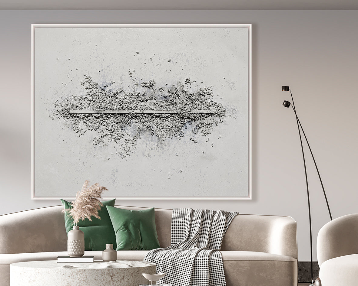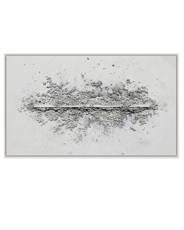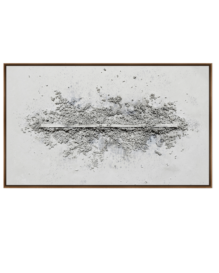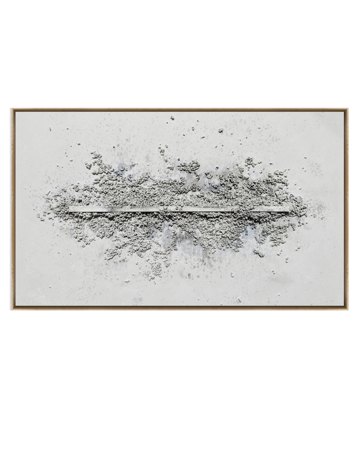Ligne Claire is an expression of clarity and quiet strength. A refined central line anchors the composition, while textured mineral forms gently rise from its surface as though shaped by time and light. This piece speaks to stillness in motion and the beauty of balance. With its soft grey palette and sculptural simplicity, it brings a grounded yet uplifting presence to any space.