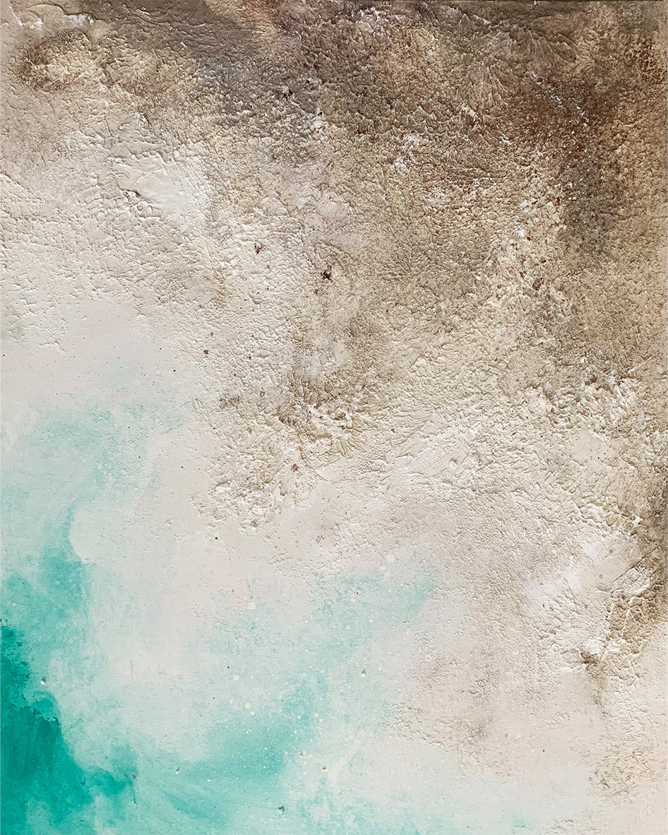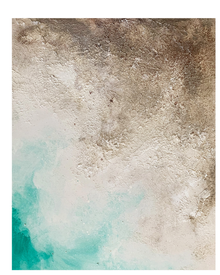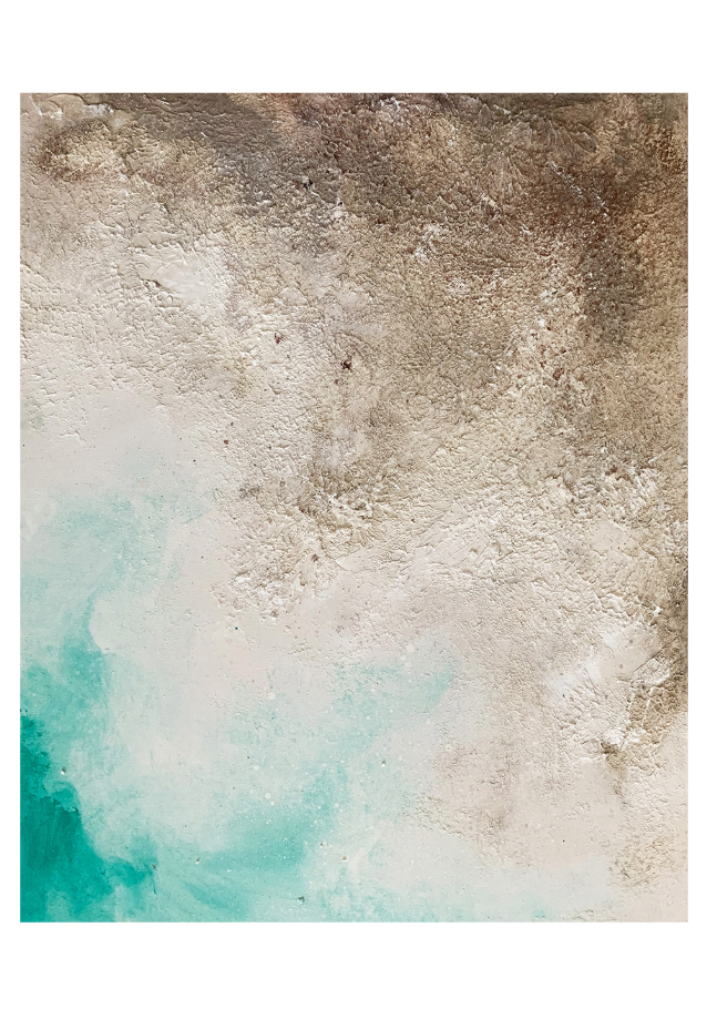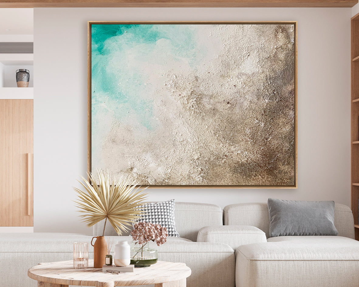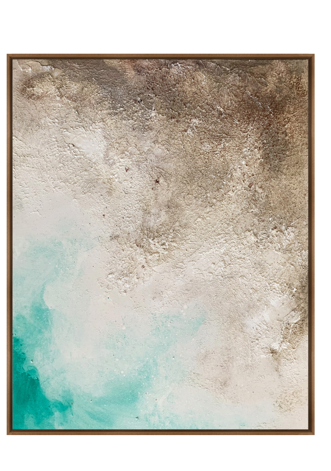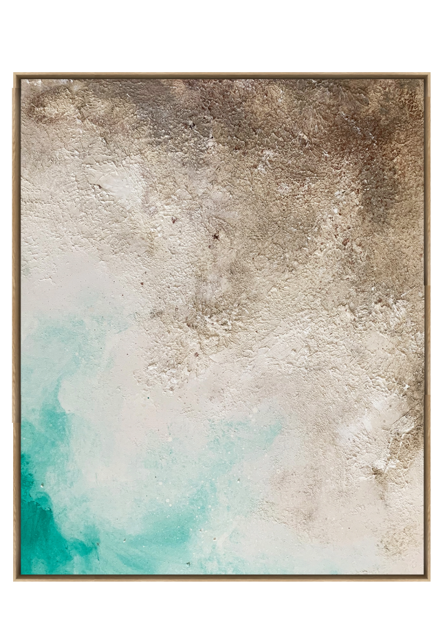Lunair captures the soft meeting point between earth and light. Textured stone tones dissolve into cool aqua, creating a sense of breeze, water and mineral warmth. With its natural flow and atmospheric palette, this piece feels both grounding and refreshing, a serene focal point for interiors seeking calm, clarity and understated beauty.