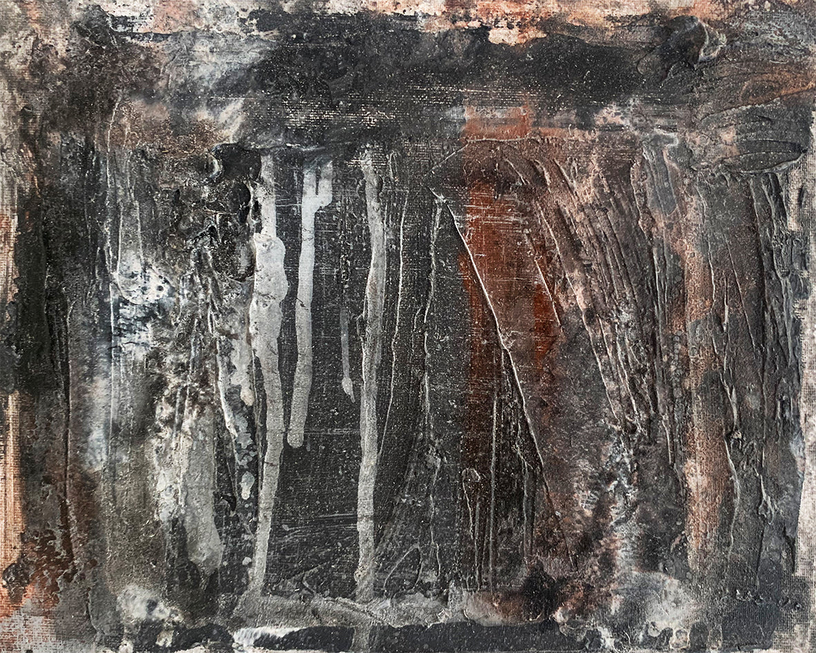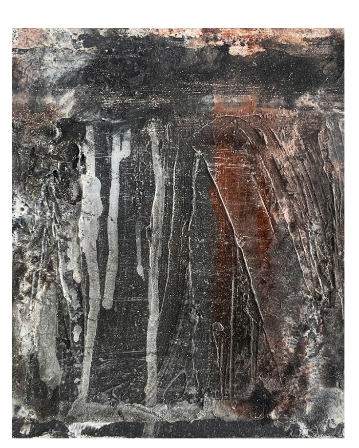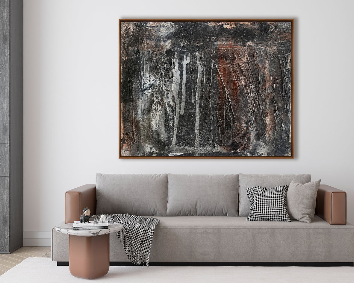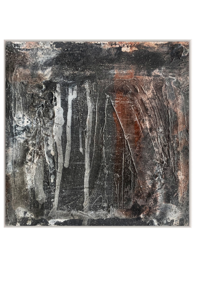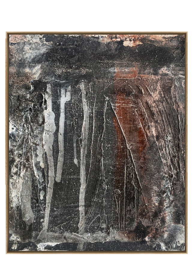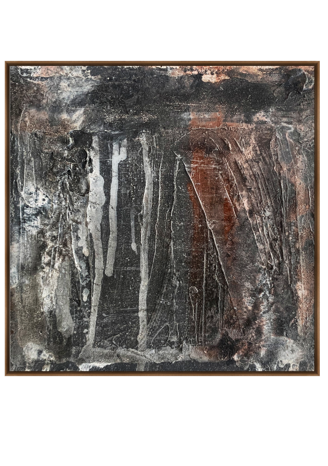 Nerico is steeped in a brooding elegance, where layers of charred blacks and rusted tones converge like aged walls bearing untold stories. Drips and scratches create a rhythm of decay and resilience, evoking twilight cityscapes and worn industrial beauty. The composition hums with quiet defiance, raw, textured, and unflinchingly grounded.