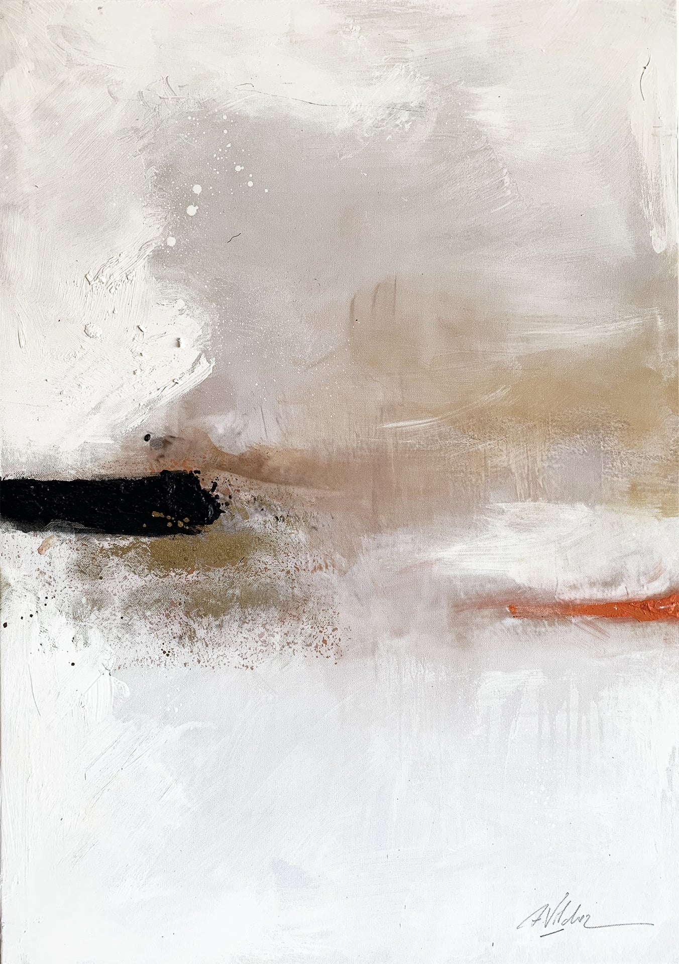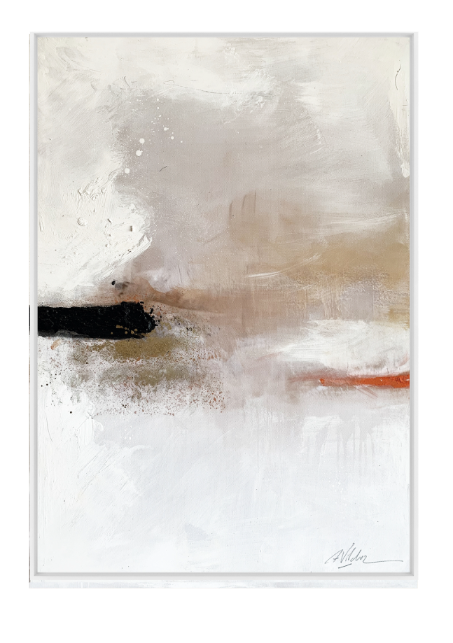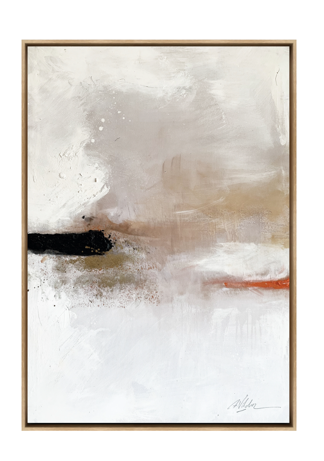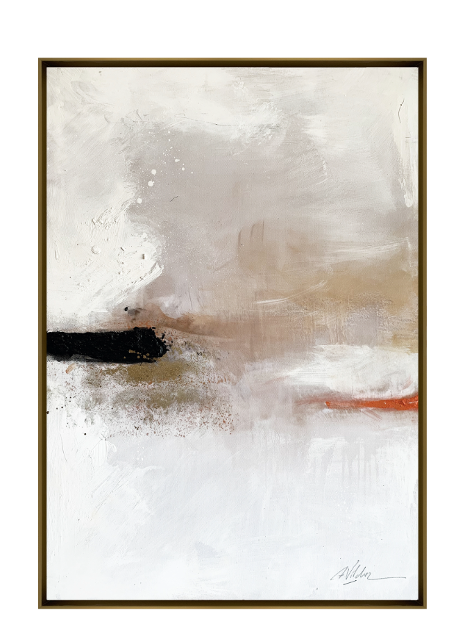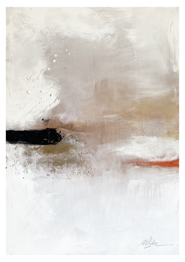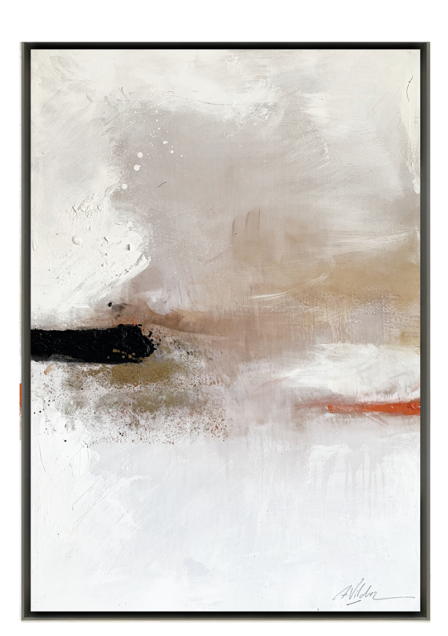 Orto 2 continues the story of gentle abstraction, offering a quieter and more spacious expression. Earthy layers dissolve into one another, with soft ivory and muted sienna blurring into tones of clay and mineral green. A single stroke of black provides contrast and structure, like a shadow cast across open ground. Where Orto suggested a cultivated landscape, Orto 2 feels more elemental, raw, open, and still. Together, they speak to grounded beauty and the simplicity of marks made with purpose. Perfect on its own or even more powerful when brought together as a set with Interno Orto 1.