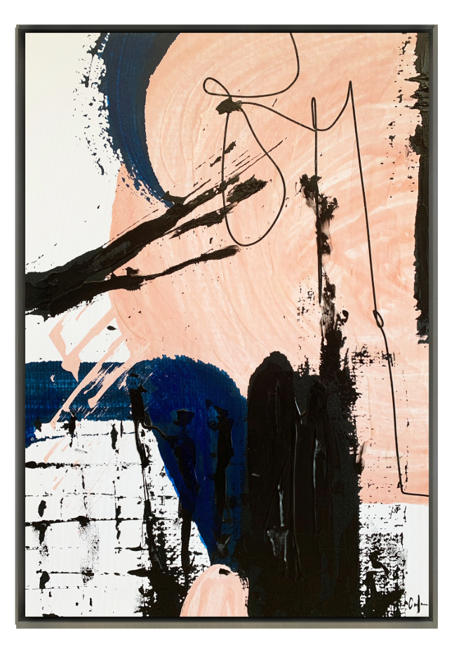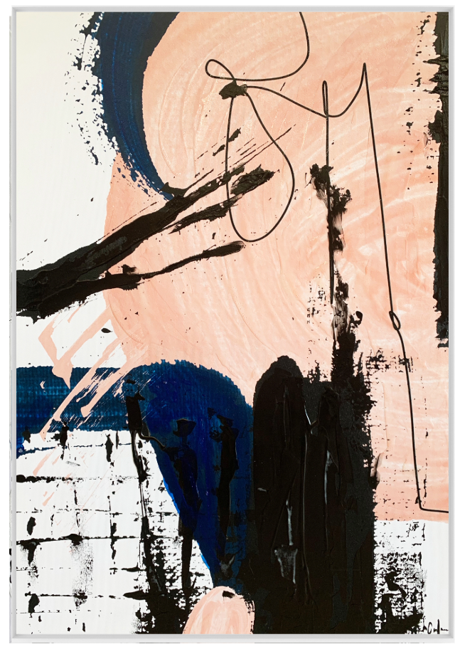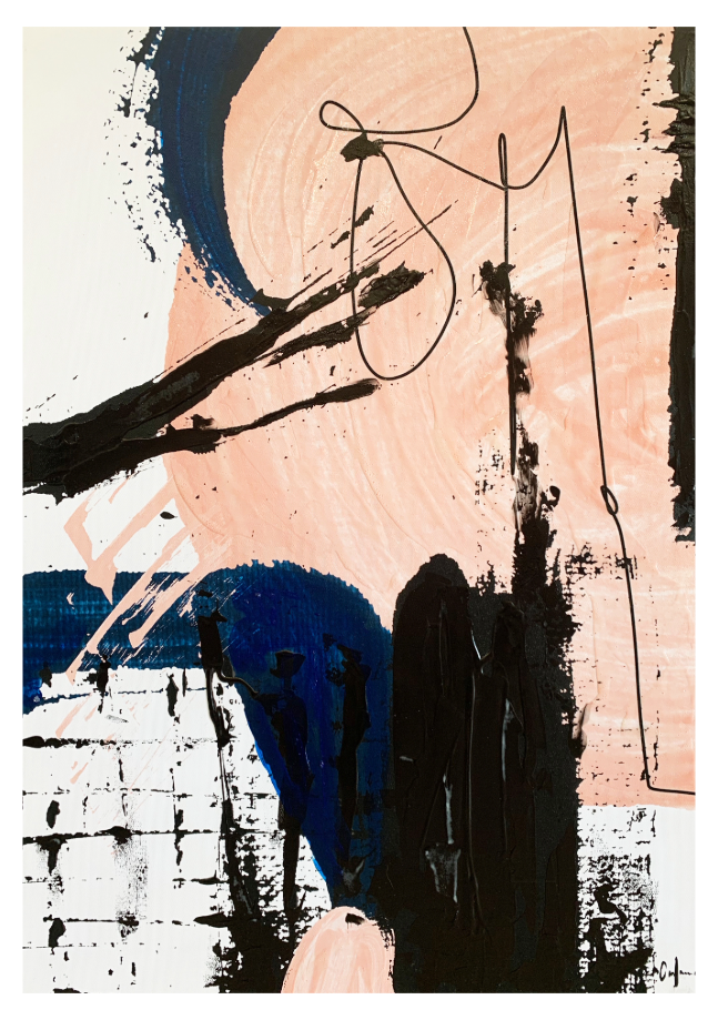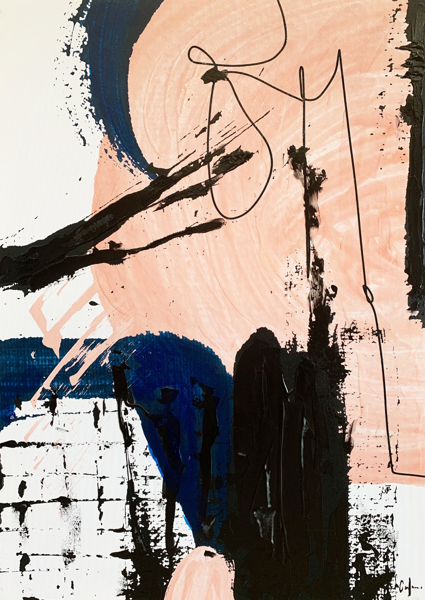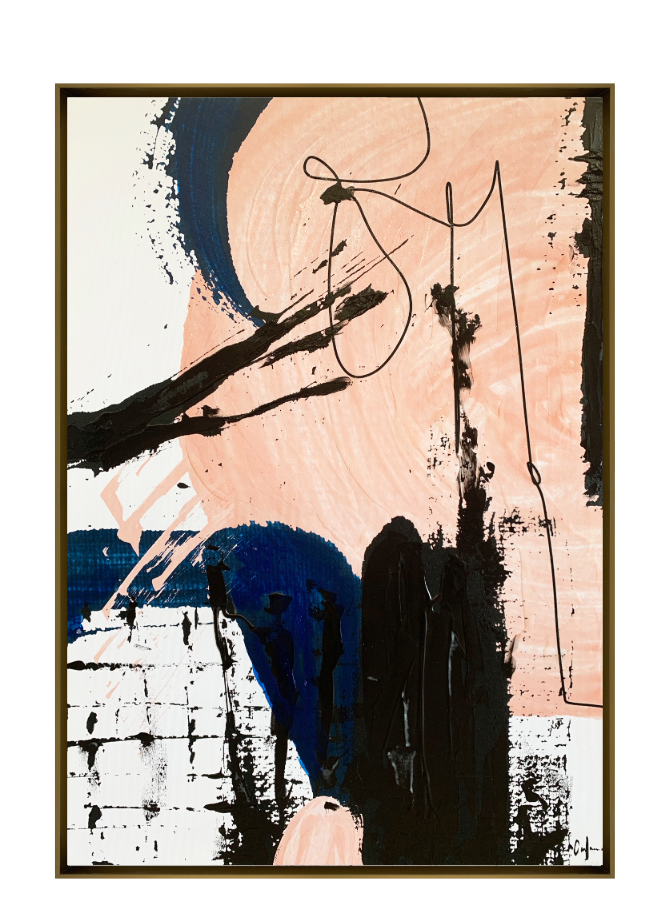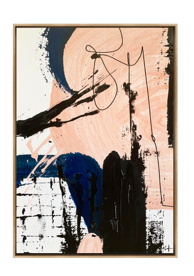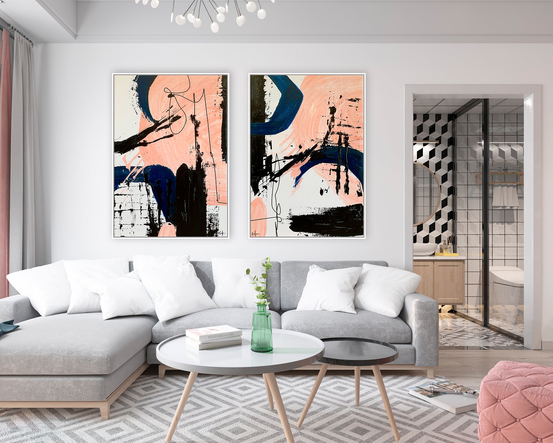 Pendula 1 captures the rhythm of suspended motion through sweeping navy arcs and soft blush forms. A looping black line draws the eye across the canvas, echoing the graceful swing of a pendulum in mid-air. Perfect on its own or even more powerful when brought together as a set with Pendula 2.