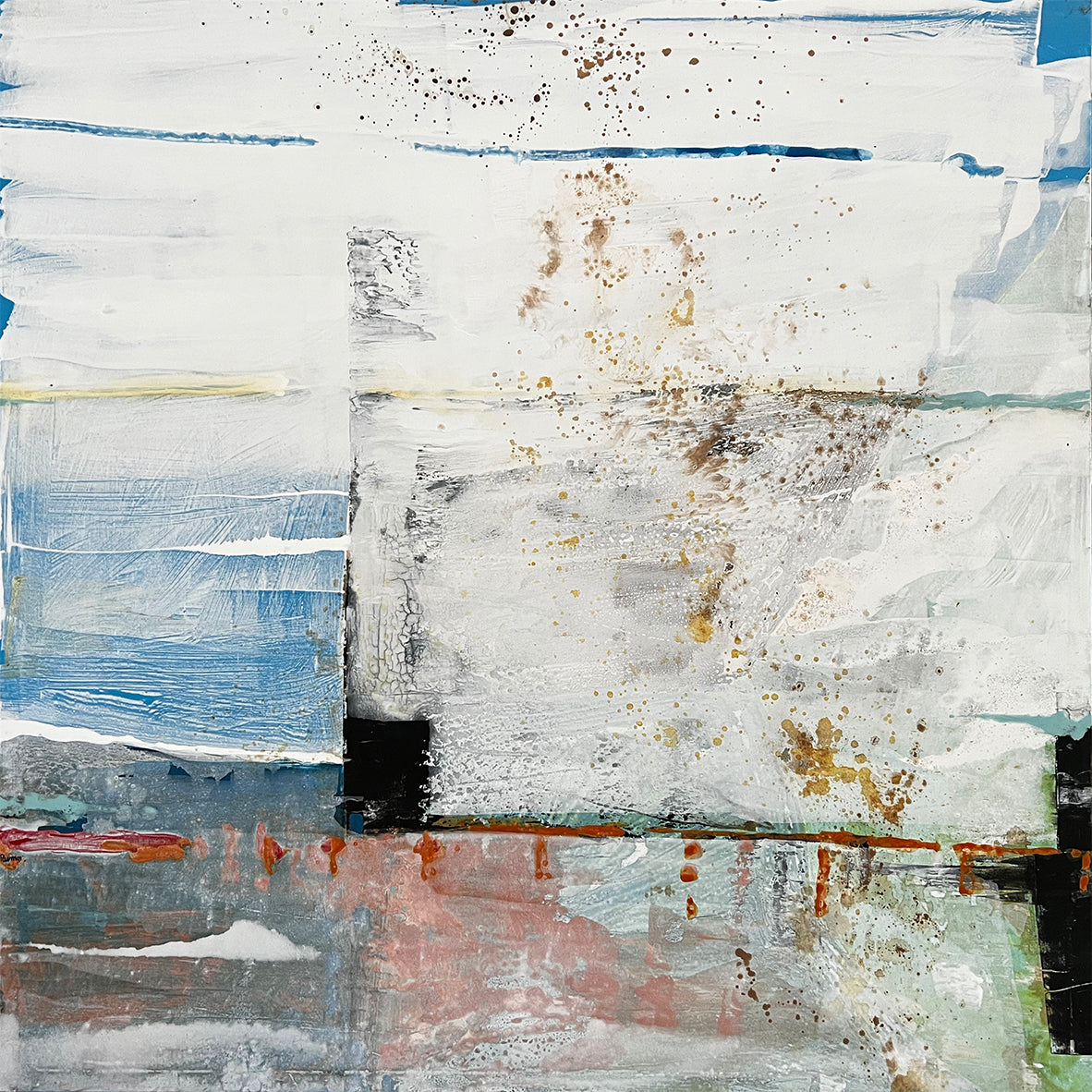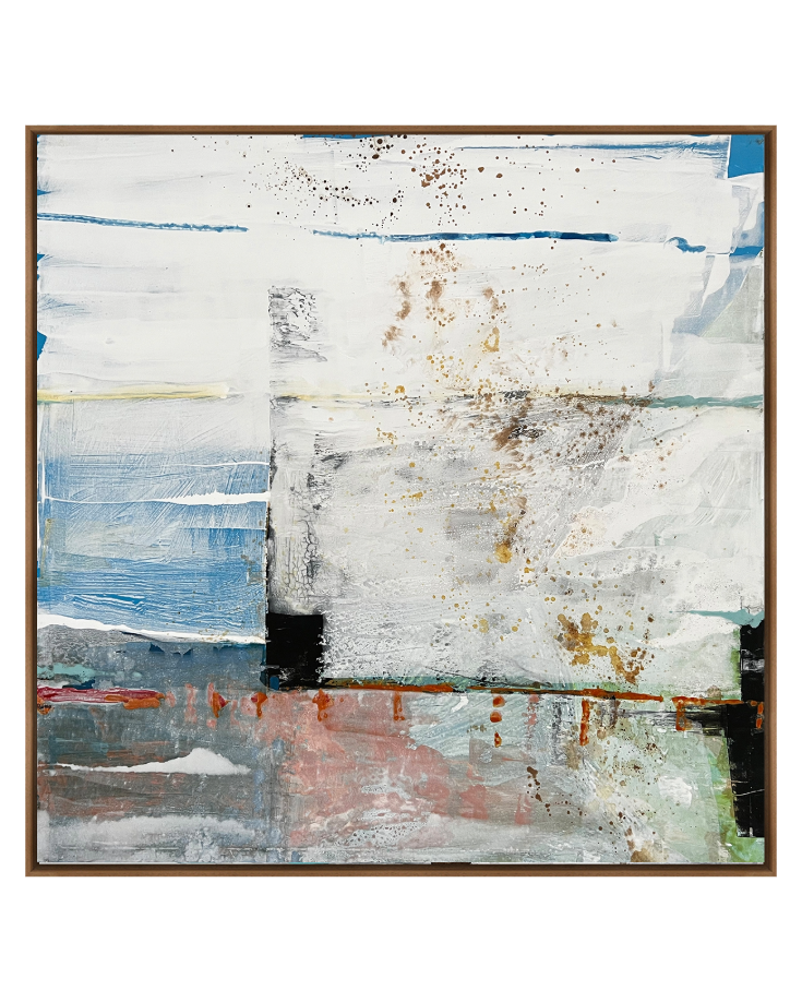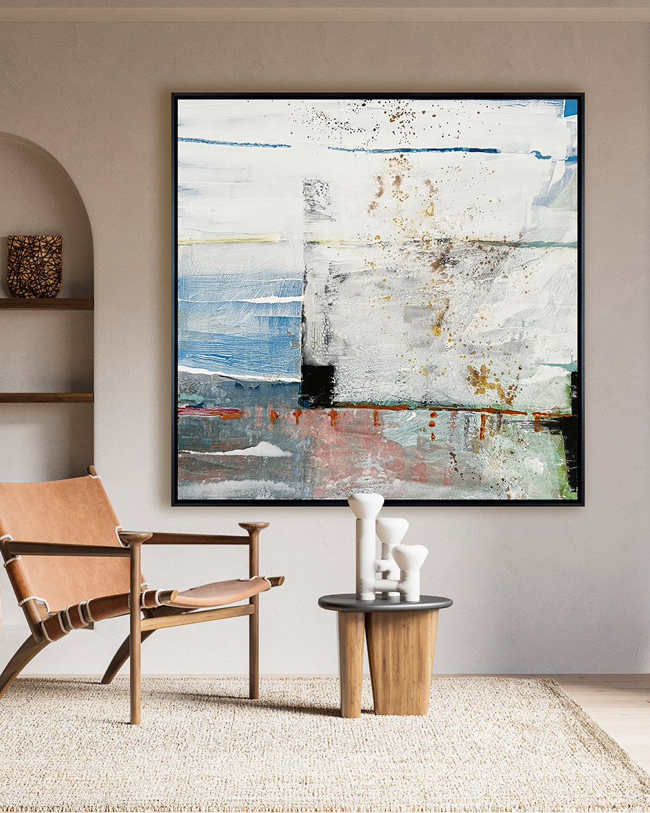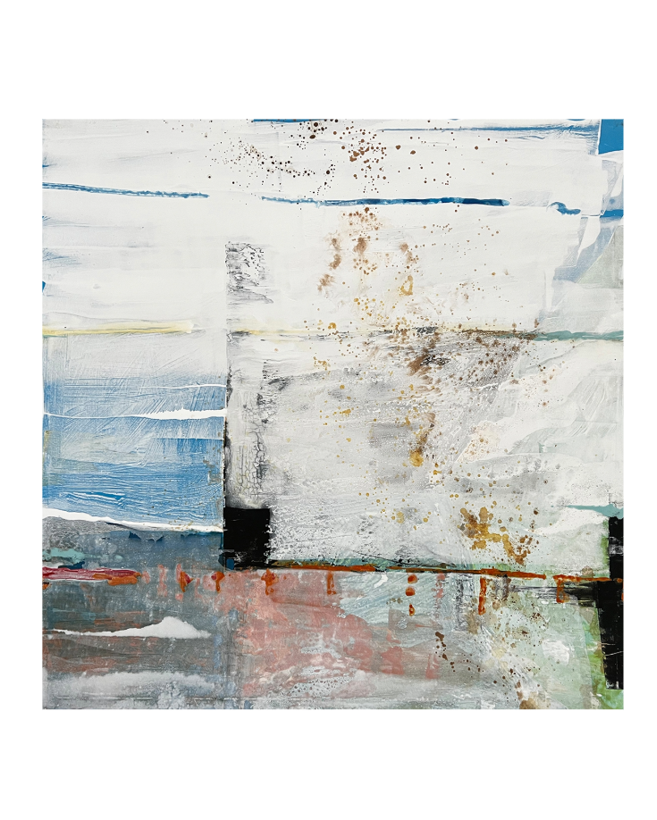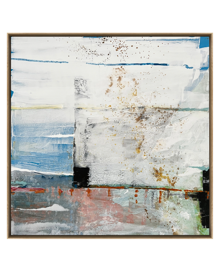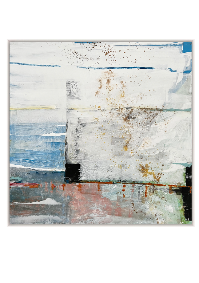 Porta Lenta captures the feeling of still movement and structured spontaneity. Soft blocks of colour, weathered textures and delicate splatters evoke a horizon viewed through time. Hints of blue, rust and mineral white suggest architectural facades or coastal walls, subtly echoing both Milanese calm and London’s layered grit. A thoughtful composition that invites pause, reflection and quiet sophistication.