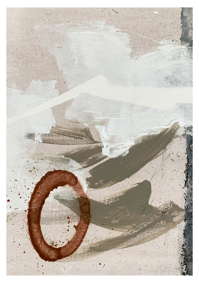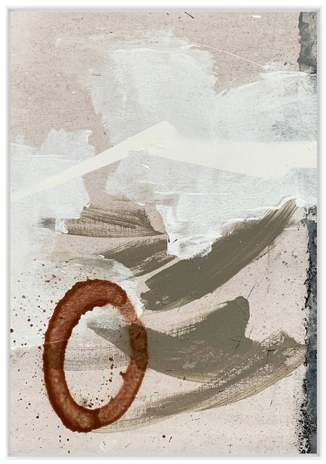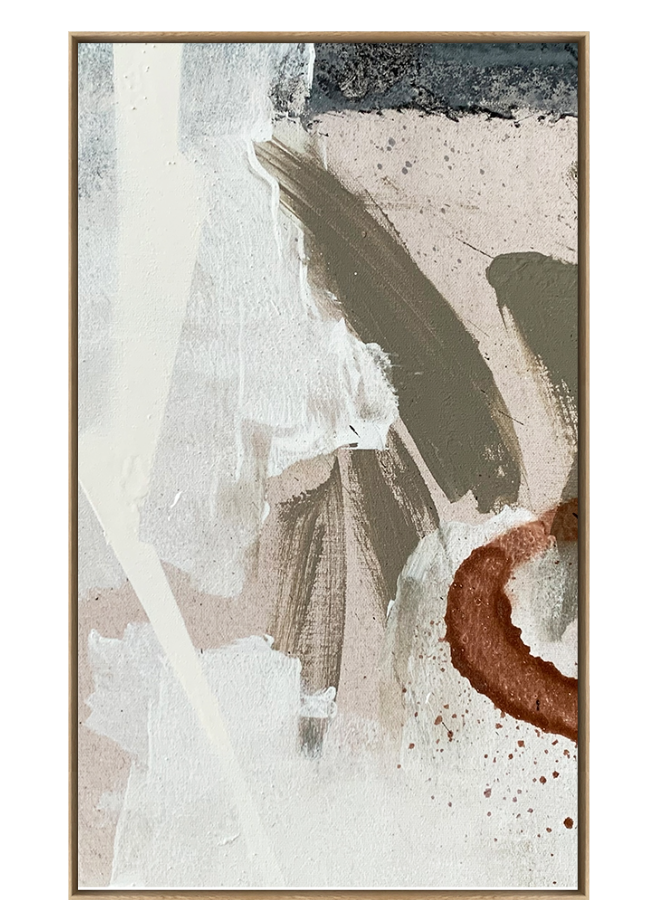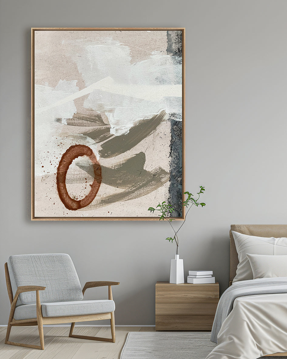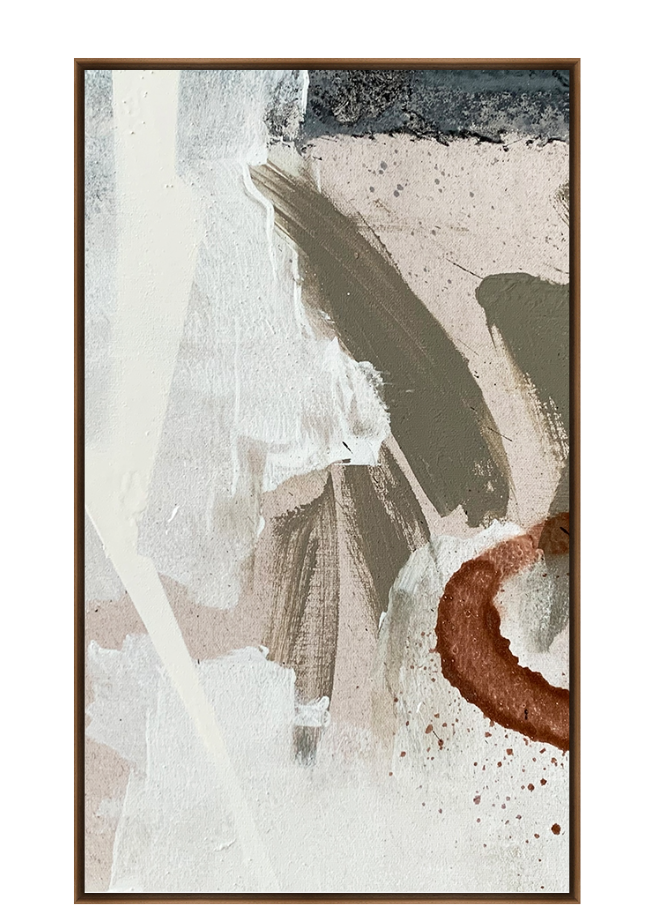 Rossa is a study in quiet strength and balanced imperfection. A solitary red circle anchors the composition with intention, while abstract brushstrokes in earthy taupe and ivory drift across a raw, textured ground. Subtle tonal contrasts and layered gestures evoke echoes of fresco walls and studio sketches, creating a piece that feels both spontaneous and deliberate. Calm yet impactful, it brings a sense of artistic poise to any space.